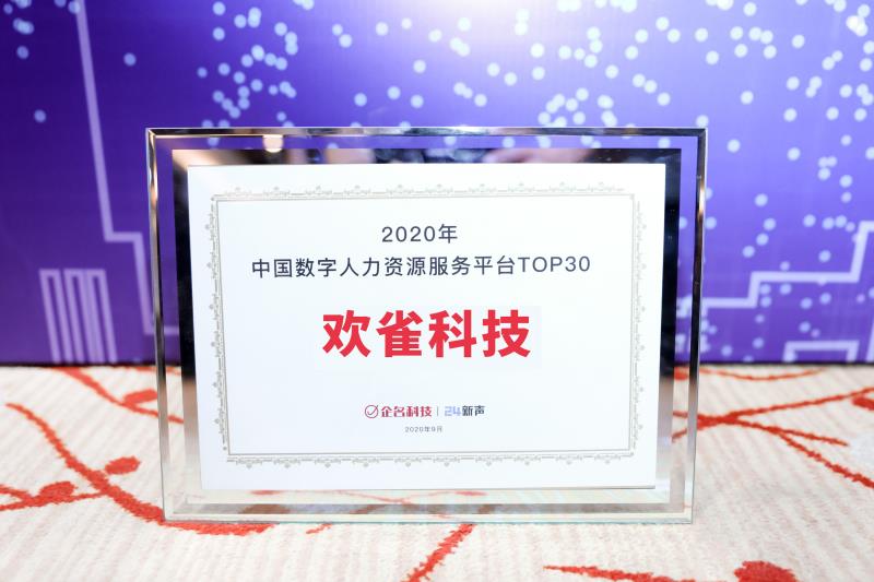 欢雀科技凭借多年在人力资源数字化的探索和良好的客户口碑荣获2020年中国数字化人力资源服务平台TOP30。